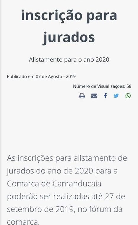 O TRIBUNAL DE JUSTIÇA DO ESTADO DE MINAS GERAIS informa que se encontra aberto prazo para que cidadãos e servidores públicos se manifestem quanto à intenção de alistamento de jurados do ano de 2020, sendo que os interessados poderão procurar o Fórum da Comarca de Camanducaia/MG até o dia 27.09.2019.
