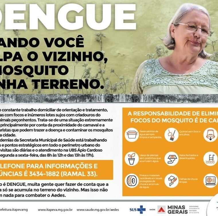 O Setor de Endemias da Secretaria Municipal de Saúde está trabalhando nos domicílios e pontos estratégicos em todo o perímetro urbano do município. As visitas são diárias e o atendimento na UBS Ápio Cardoso também (de segunda a sexta-feira, das 8h às 12h e das 13h às 17h).