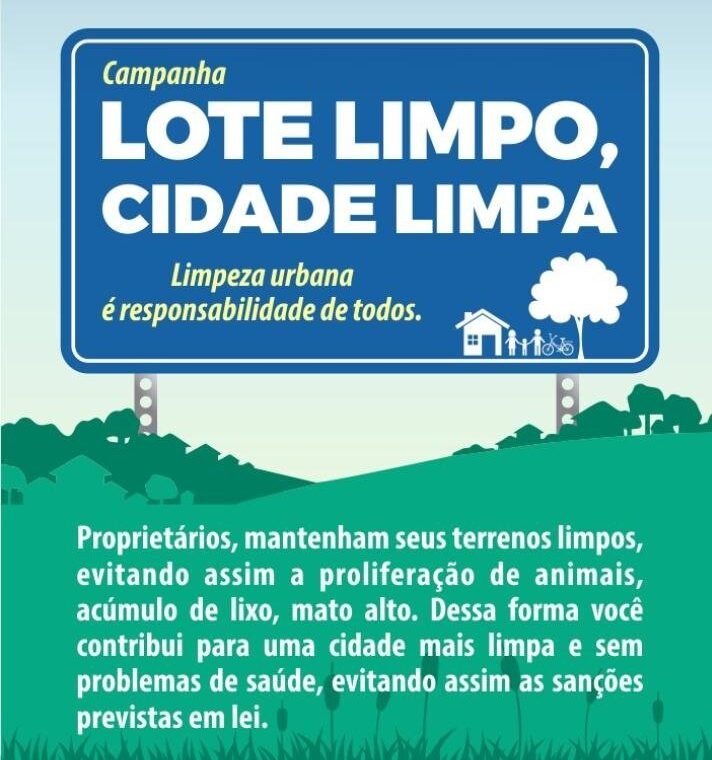 A responsabilidade de manter os lotes baldios particulares sempre limpos é do proprietário e/ou possuidor. Assim, a partir do dia 17/02/2020, o Setor de Obras do Município irá notificar os proprietários/possuidores a realizar a limpeza de seus imóveis, sob pena de aplicação de multa prevista em Lei. Caso o imóvel permaneça em situação irregular, o município poderá fazer a limpeza e cobrar pelo serviço do proprietário/possuidor.