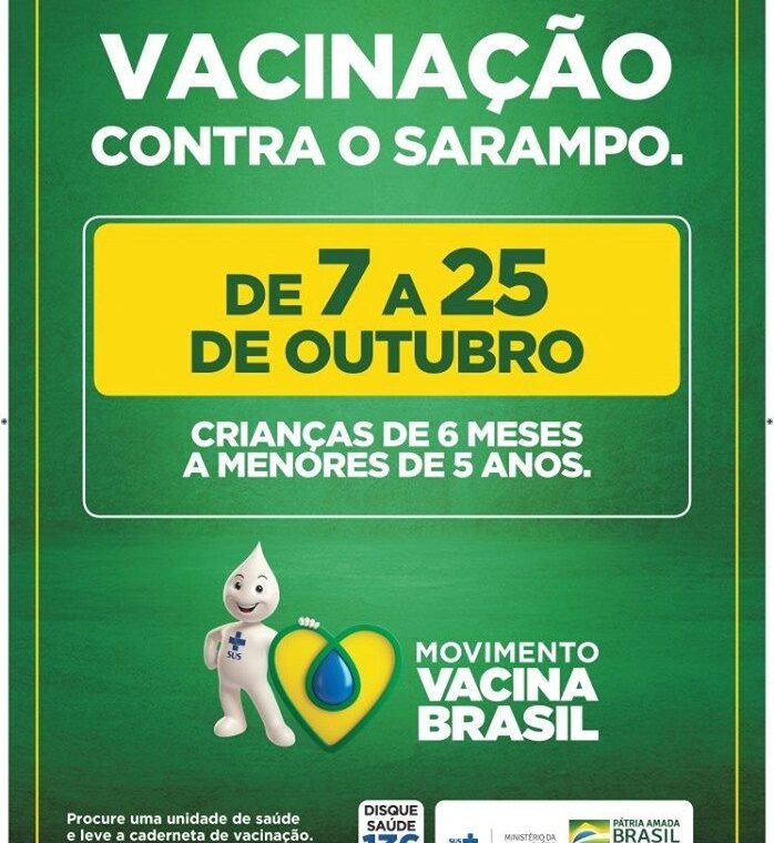 Entre 07 e 25 de outubro de 2019 está acontecendo a Campanha de Vacinação contra o Sarampo destinada para crianças de 6 meses a menores de 5 anos (4 anos 11 meses e 29 dias).