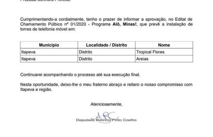 Através do apoio e intercessão do Deputado Estadual Alberto Pinto Coelho “Betinho”, a cidade de Itapeva/MG será contemplada no Programa Alô Minas, do governo estadual,