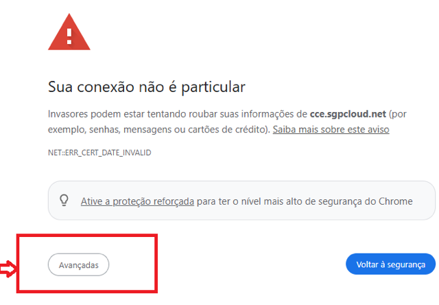 Caso apareça um aviso de segurança, clique em “Avançadas” e depois em “Prosseguir”;