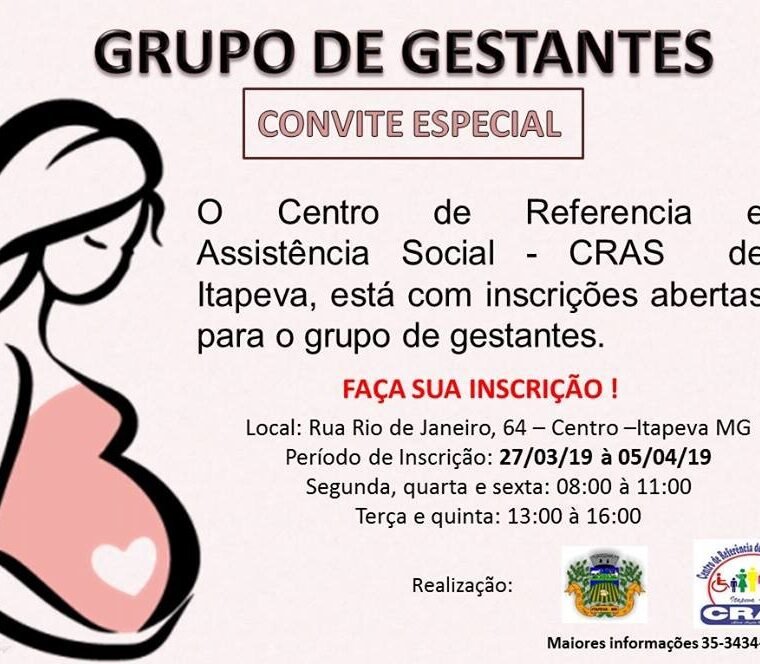 Se você está gestante até o 5º Mês e tem interesse em participar do Grupo, faça sua inscrição no CRAS no período de 27/03/2019 à 05/04/2019.