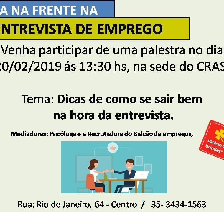 O balcão de Emprego do CRAS está oferecendo uma palestra gratuita para pessoas que estão em busca de uma oportunidade no mercado de trabalho.